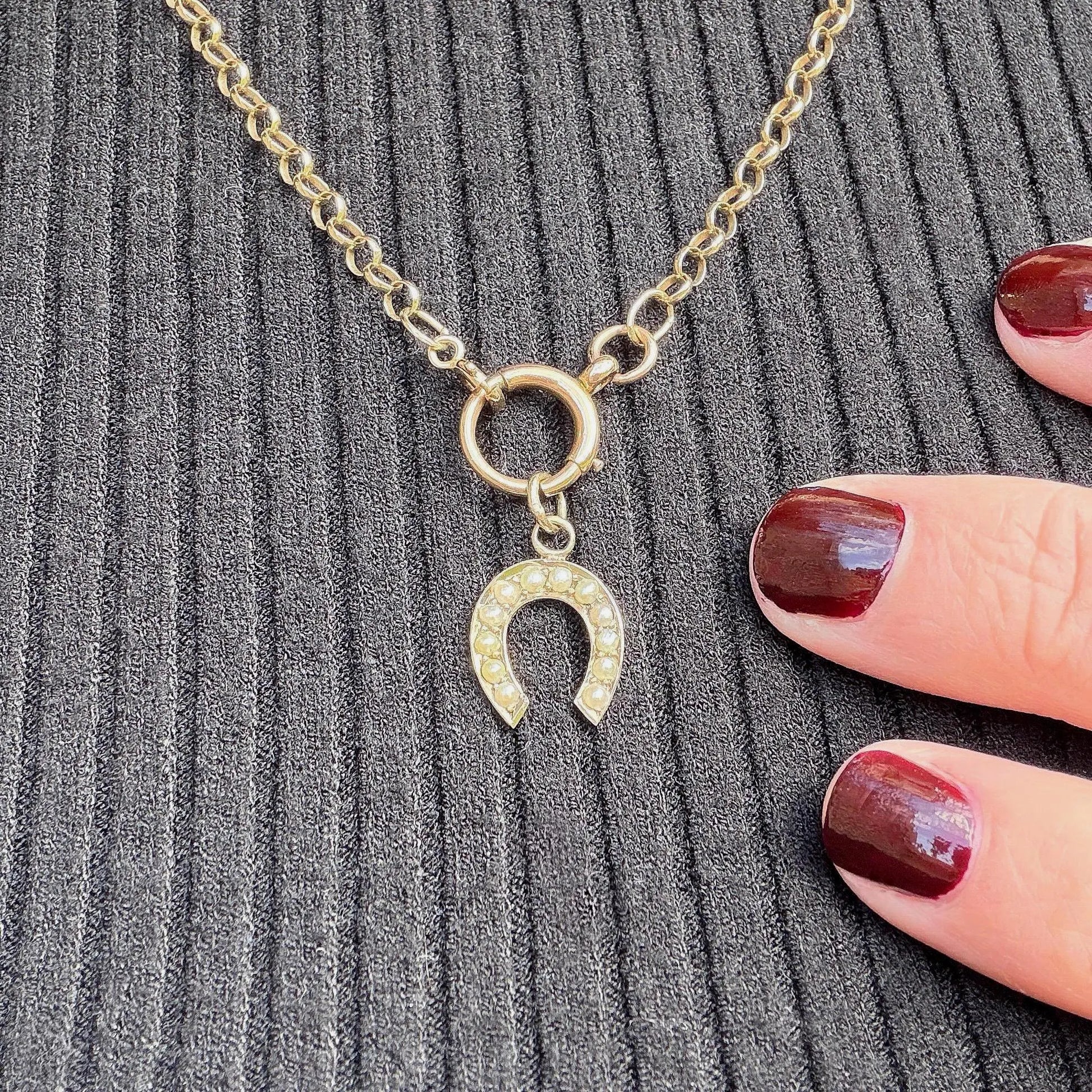 Converted from a Victorian stick pin to a pendant, this 9k gold and seed pearl lucky horseshoe charm is a unique antique piece. The jump ring added is also 9k gold.