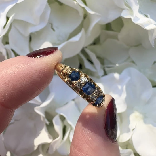 An antique 18ct gold tri sapphire and diamond ring featuring a central square cut sapphire, four dainty diamonds and two round cut sapphires.